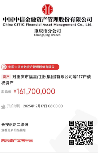 中国中信金融资产管理股份有限公司重庆市分公司(以下简称我分公司)拥有对重庆市福星门业(集团)有限公司等117户不良债权资产。我分公司将于2025年12月17日8:00至2025年12月17日18:00止在京东拍卖网通过公开竞价方式进行处置,拍卖链接如下图所示,现予以公告。