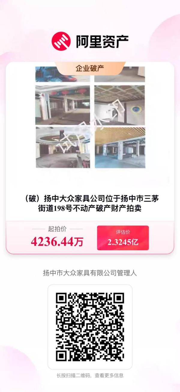 中国中信金融资产管理股份有限公司江苏省分公司拥有对扬中市大众家具有限公司户不良债权资产,该户抵押资产对应的整体破产财产定于2026年5月9日10时至2026年5月10日10时在阿里资产拍卖平台专栏(https://zc-paimai.taobao.com/)进行公开拍卖,欢迎各投资人积极洽谈投资与合作事宜。